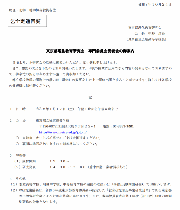 1/18(土)午後,立川高校で専門委員発表会研究発表会を行います。